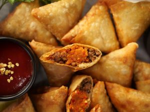 -Take samosa sheet & make pocket,add prepared mince filling,prepared red chutney,mince filling,roll into the shape of samosa & seal corners with flour slurry (makes 15).