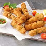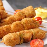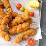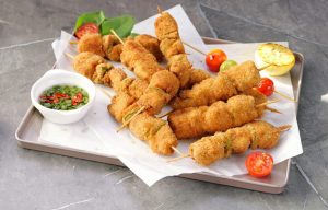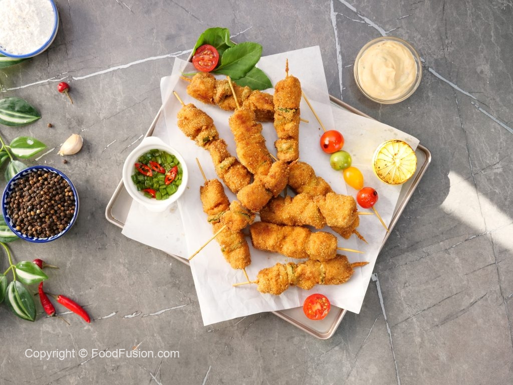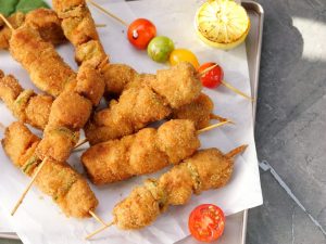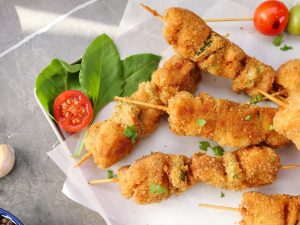 -Coat chicken skewers in all-purpose flour then dip in whisked eggs & coat with breadcrumbs (makes 14-15).