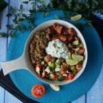 On a serving dish,add quinoa,greek salad,prepared chicken & tzatziki sauce.