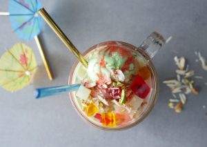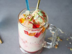 In serving glass,add falooda sev,basil seeds,lal sharbat,prepared rabri milk,yellow jelly,red jelly,pistachio ice cream scoop,falooda sev,basil seeds,pineapple chunks,red jelly,yellow jelly,lal sharbat,almonds, pistachios & serve!