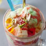 Serving glass mein falooda sev,tukh malanga,lal sharbat,tayyar rabri doodh,yellow jelly,red jelly,pista ice cream scoop,falooda sev,tukh malanga,pineapple chunks,red jelly,yellow jelly,lal sharbat,badam aur pista dal ker serve karein.