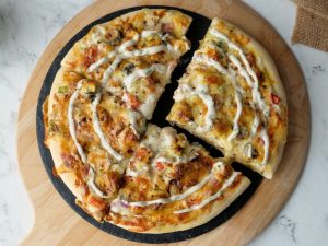 Add & spread ranch sauce 3-4 tbs,cheddar cheese,mozzarella cheese,cooked chicken,capsicum,onion, tomatoes,mushrooms,black olives,cheddar cheese,mozzarella cheese,dried oregano & red chilli crushed (makes 3 medium Pizzas).