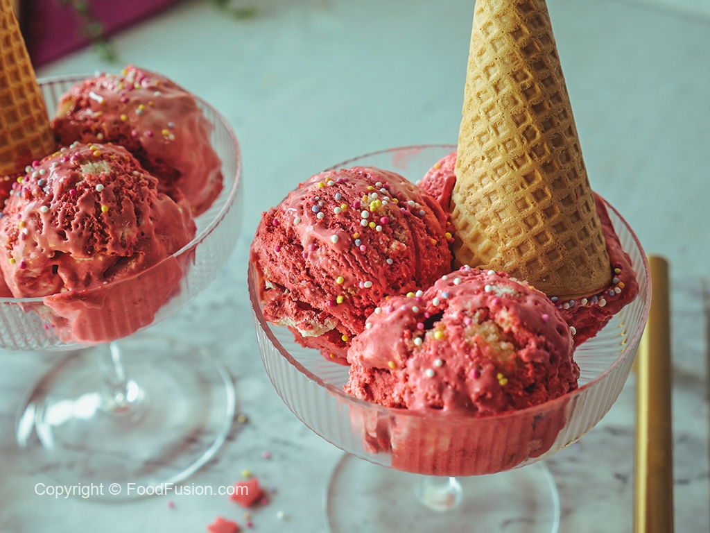 Make swirls gently with the help of skewer,cover the surface of ice cream with butter paper then cover with lid and freeze for 8 hours to overnight (yields: 2.5 litres).