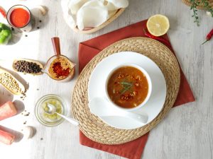 -In a serving bowl,add hot & sour soup & garnish with spring onion leaves,chilli oil & serve!