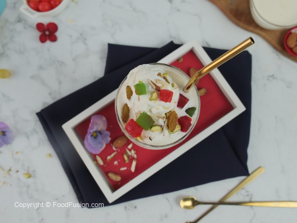 -Serving glass mein soaked tukhme Balanga,lal sharbat,tayyar falooda sawaiyan,mixed nuts,green jelly,red jelly,saib,banana,garpes,pineapple,tayyar rabri, aur vanilla ice-cream dal dein,mixed nuts aur tutti frutti sa garnish ker ka serve karein!