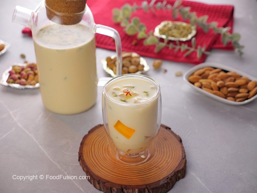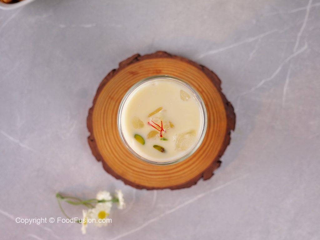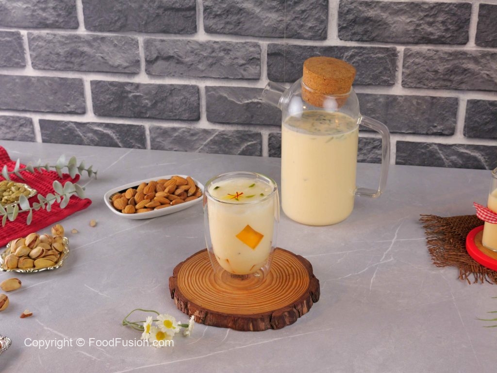 -Ek wok mein, badam zafran flavoured milk dalein aur ubal ane dein.