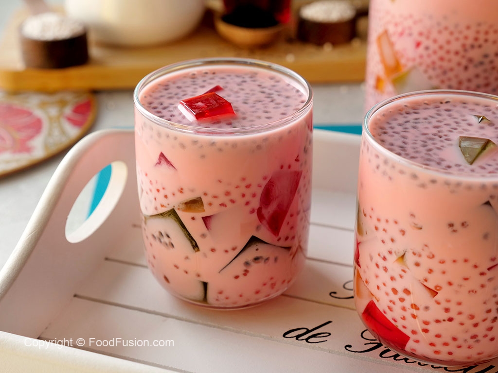 In a jug,add ice cubes,coloured jelly cubes,cooked tapioca sago,soaked basil seeds & prepared milk,mix well & serve!