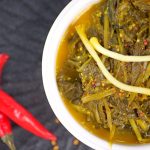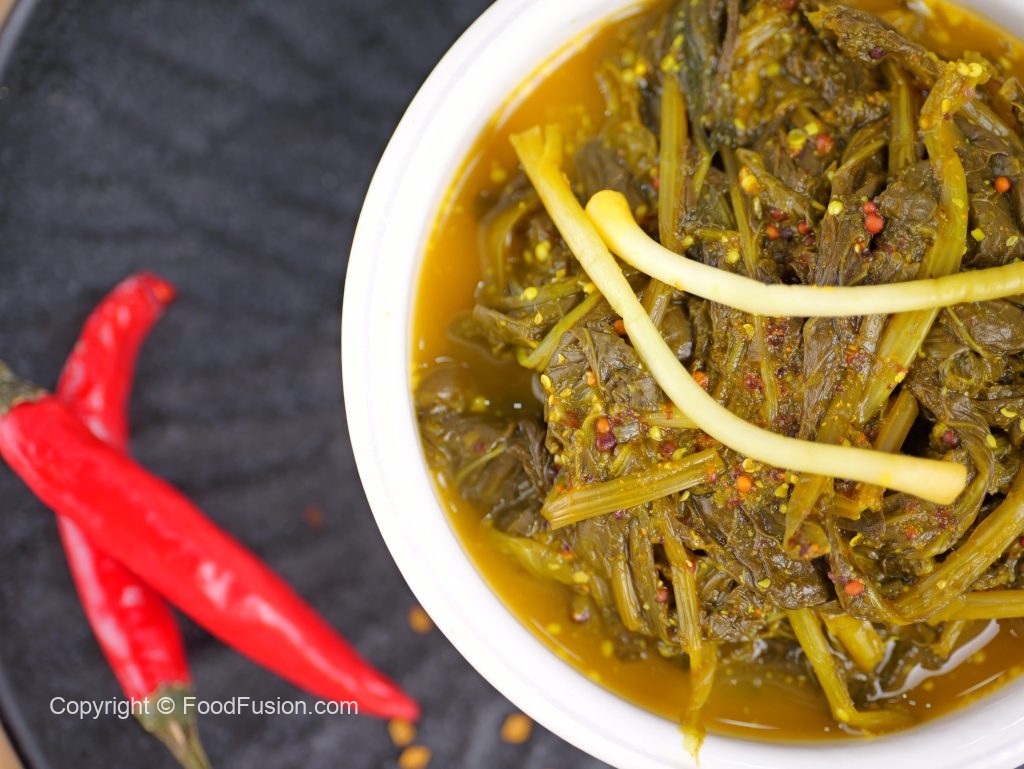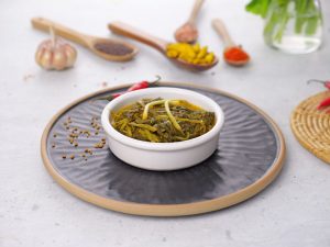 -In a jar, add boiled mustard leaves, green garlic, pink salt, red chilli powder, turmeric powder, mustard seeds, cover & shake until well combined.