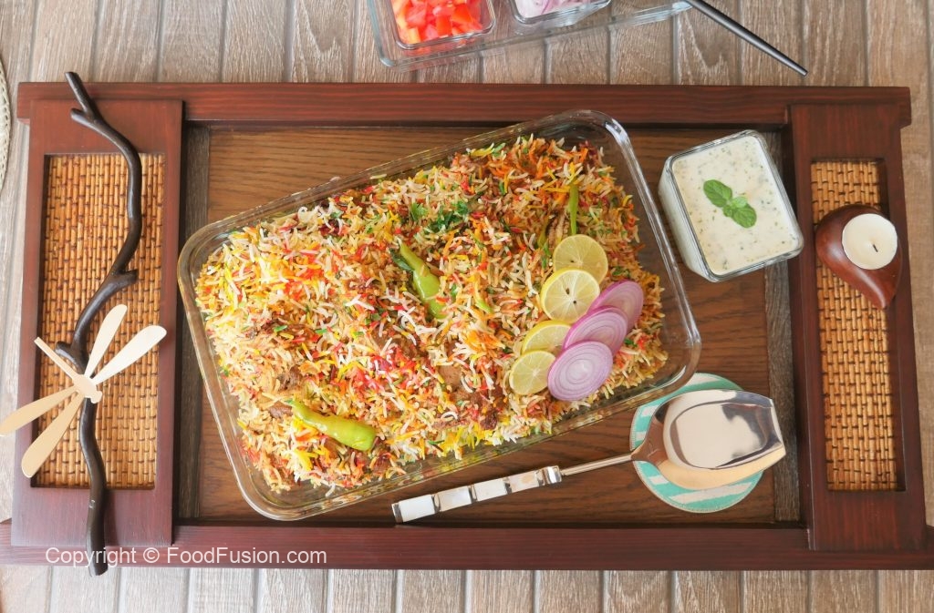 Spread dissolved red food color,green food color,orange food color & yellow food color,mint leaves, fresh coriander,fried onion,cover & steam cook on low flame for 18-20 minutes.