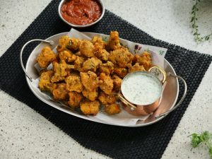 -Bowl mein chicken,pink salt,lal mirch crushed,sabut dhania,zeera,ajwain,lal mich powder,garam masala powder,lemon juice,zarda ka rang,baking soda,baisan,chawal ka atta,til,hara pyaz aur hara dhania dal dein.