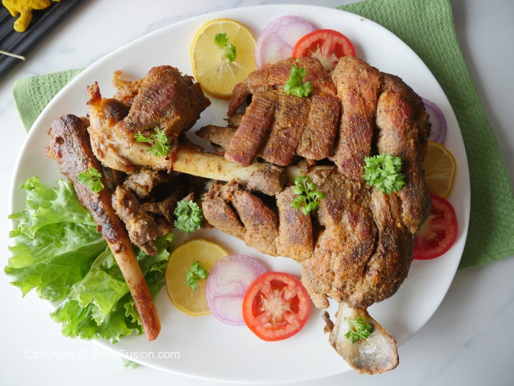 Baking tray per aluminum foil aur butter paper laga ker marinated mutton leg rakh ker marinade dal dein aur foil ko properly seal ker lein.