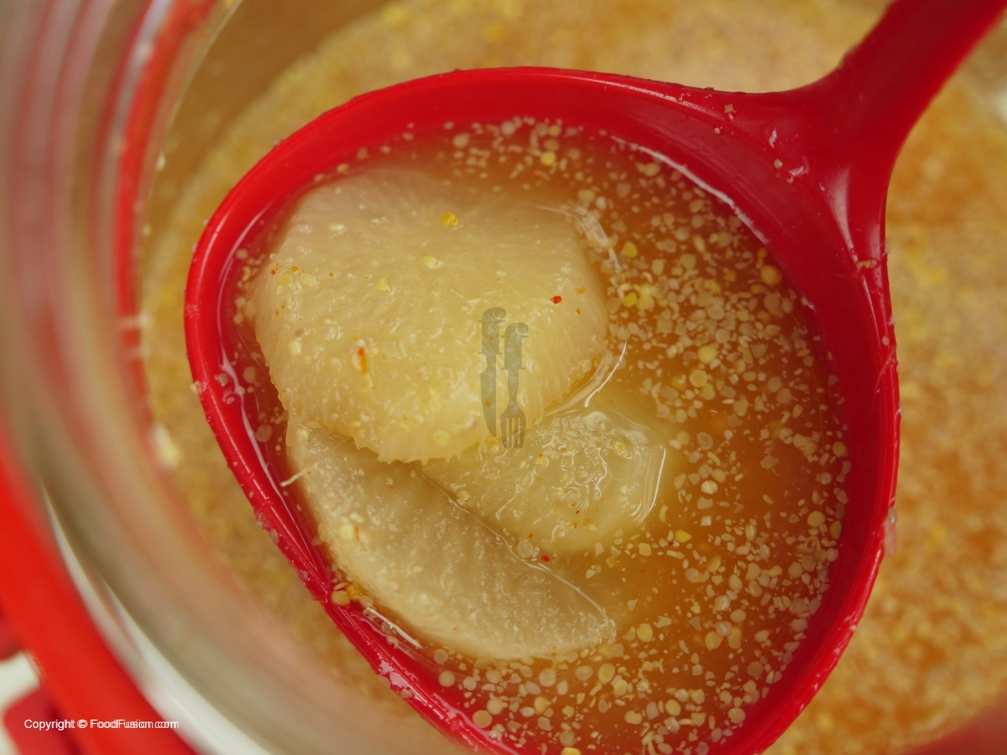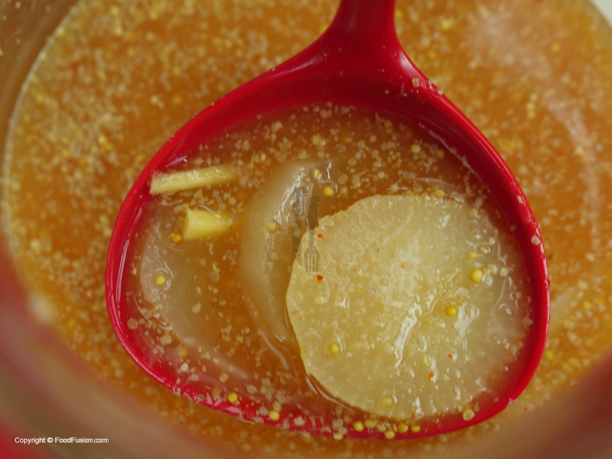 • In turnips,add ginger garlic paste,salt,red chili crushed,ginger (julienne),brown sugar,vinegar,mustard seeds(crushed),red chili powder,water (boiled) and mix well.