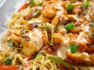 In a serving dish, spread a layer of rice on the dish. Add second layer of stir fried vegetables with noodles, than third layer of chicken gravy. Add mayo sauce and fried garlic and green chilies as top layer