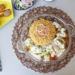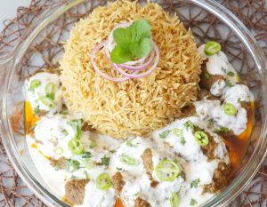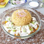 On serving dish,add prepared pulao,kabab with gravy and yogurt.