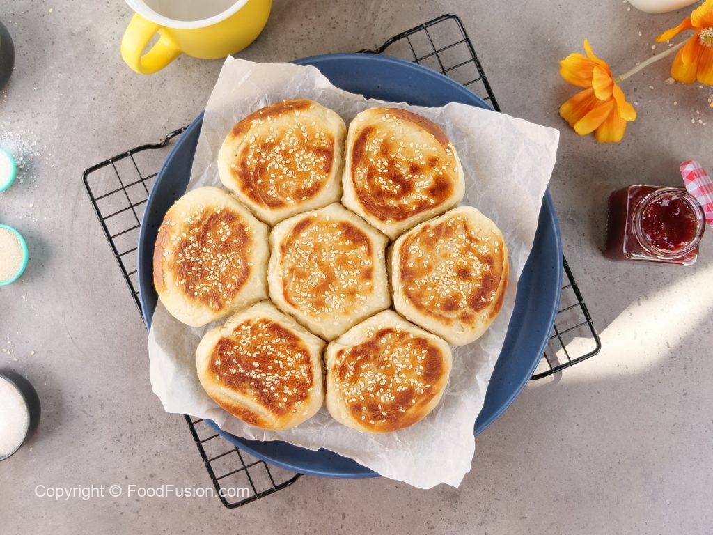 -Grease thick bottom frying pan with cooking oil,place dough balls (give a little space between dough balls),cover with cling film & let it proof for 30 minutes.