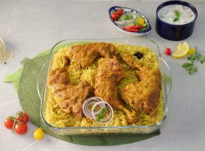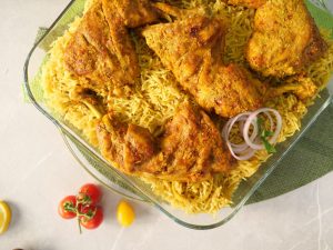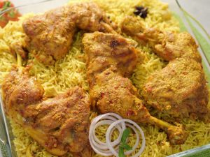 -In a dish,place fried chicken pieces,add prepared marinade,rub evenly & reserve ½ Cup of marinade for pulao,cover with cling film & marinate for 1 hour.