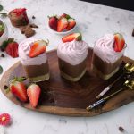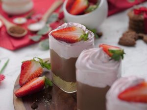 -Serving glass mein crushed biscuits,tayyar chocolate pudding & strawberry cream dal dein.