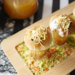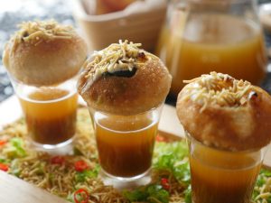 Poke gol gappa from the center,add chickpeas,potato & whole green gram,spicy green chutney,yogurt, prepared meethi chutney,sprinkle chaat masala,nimco sev & serve with prepared minty khatta pani!