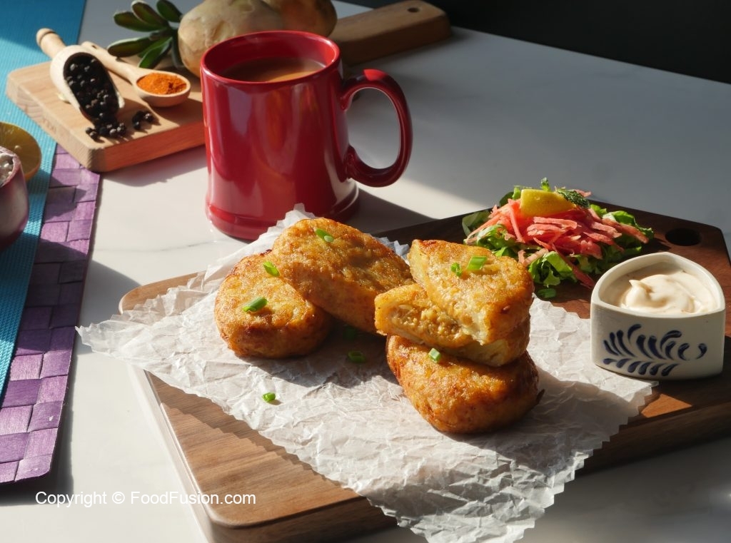 Grease hands with oil,take a potato mixture and flatten on your palm,add chicken mince mixture and cover the filling with chicken mixture to make hash brown of equal sizes (makes 14-15) and freeze for 3-4 hours before frying.