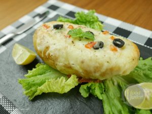 Fill potato with salt, butter, mince chicken, green onion, tomatoes. Add cheese on top, garnish with olives, black pepper and bake for 20 minutes.