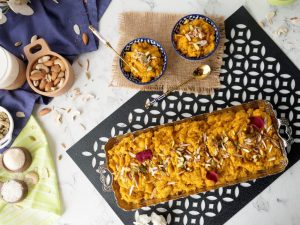 In a grinder,add green cardamom,dry dates,almonds,cashew nuts & grind to make powder & set aside.