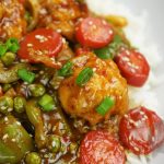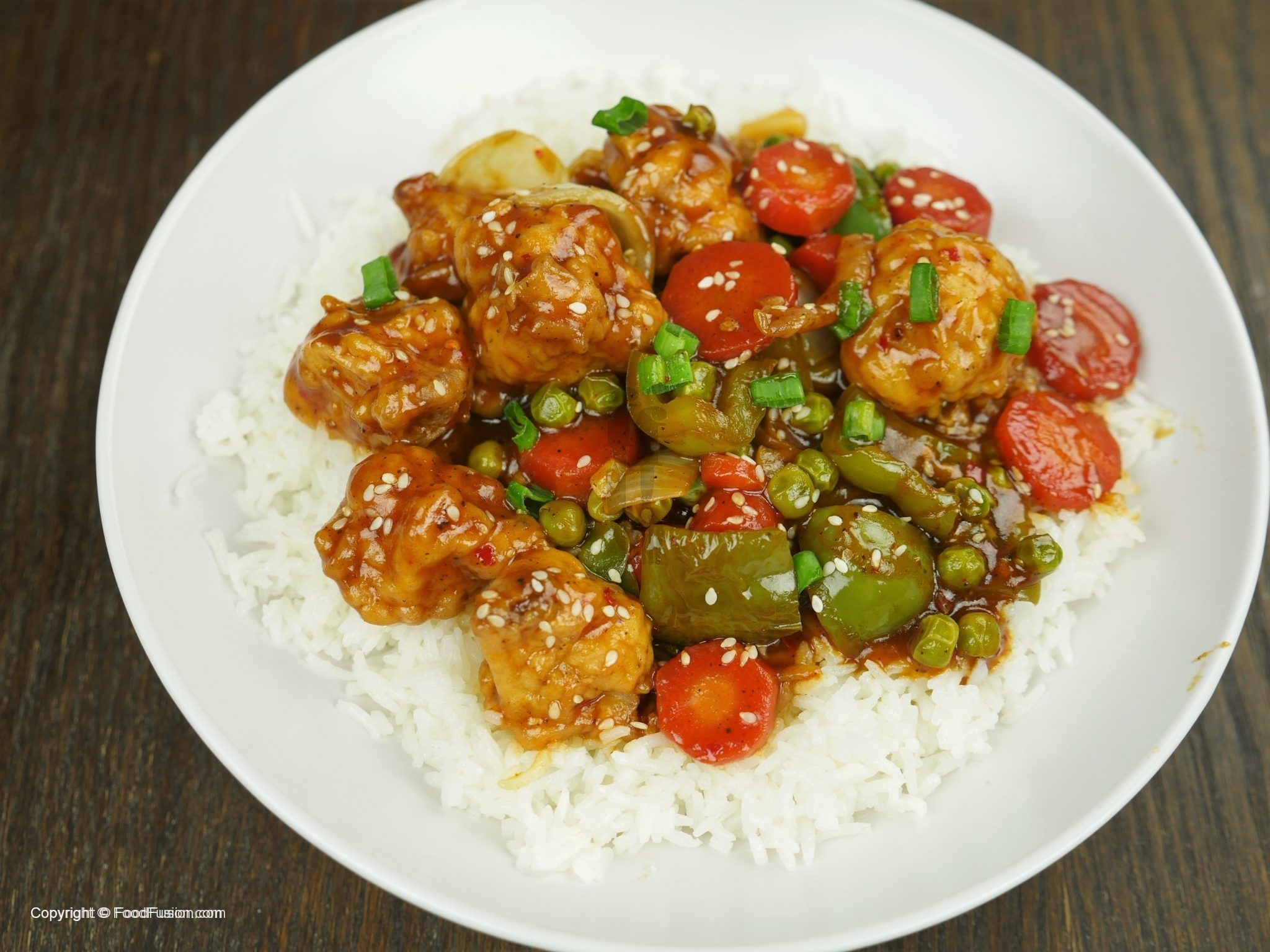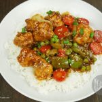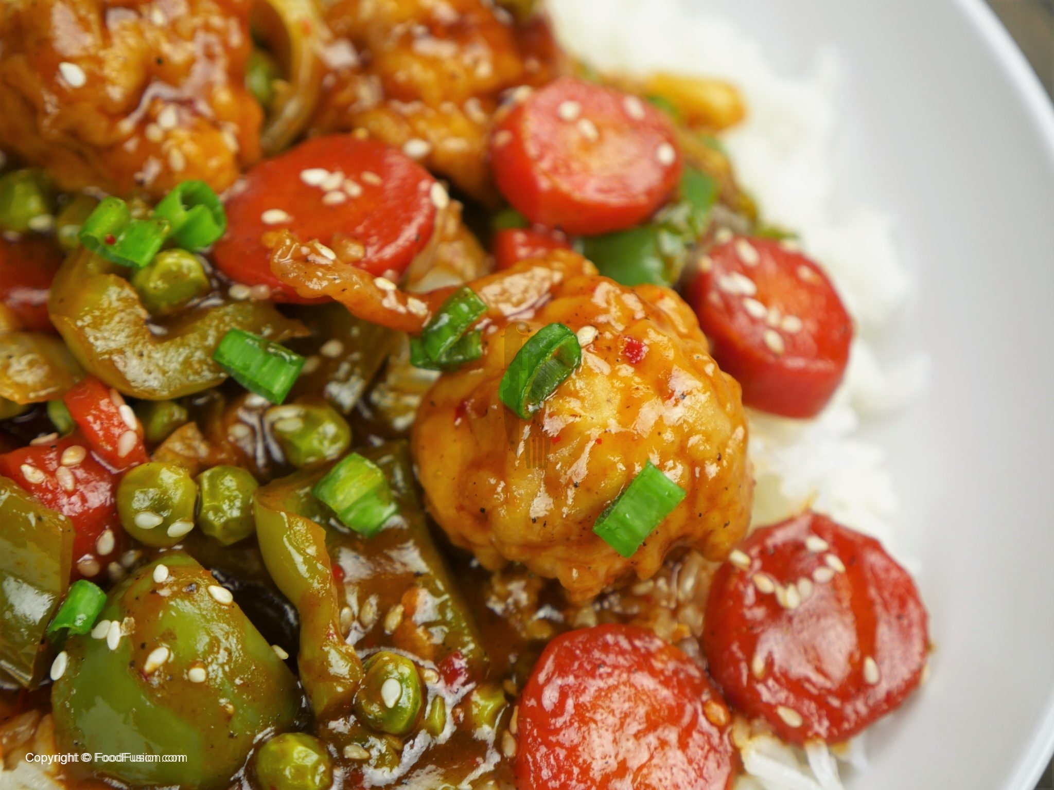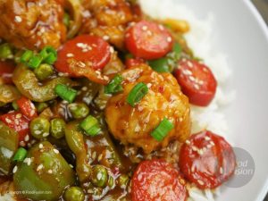 In wok,add oil and garlic (chopped) and sauté little. -Add tomato ketchup,soya sauce,worcestershire sauce,vinegar,brown sugar,red chili crushed,white pepper powder,black pepper crushed,salt and mix well. -Add chicken stock, mix it and bring it to boil. -Dissolve corn flour in water and mix well. -Add corn flour paste in gravy and give it a good mix. -Now add fried vegetables and cauliflower, mix it. -Add sesame oil and mix well. -Garnish with sesame seeds and green onion.