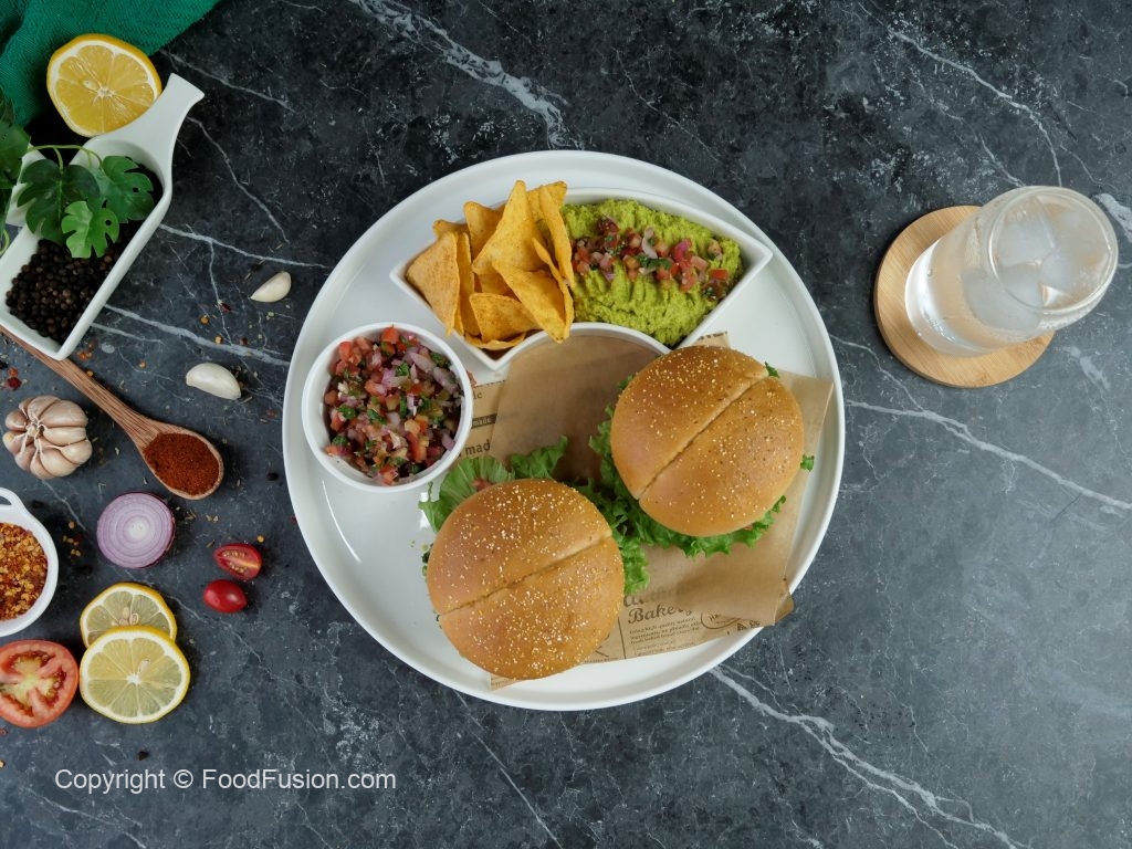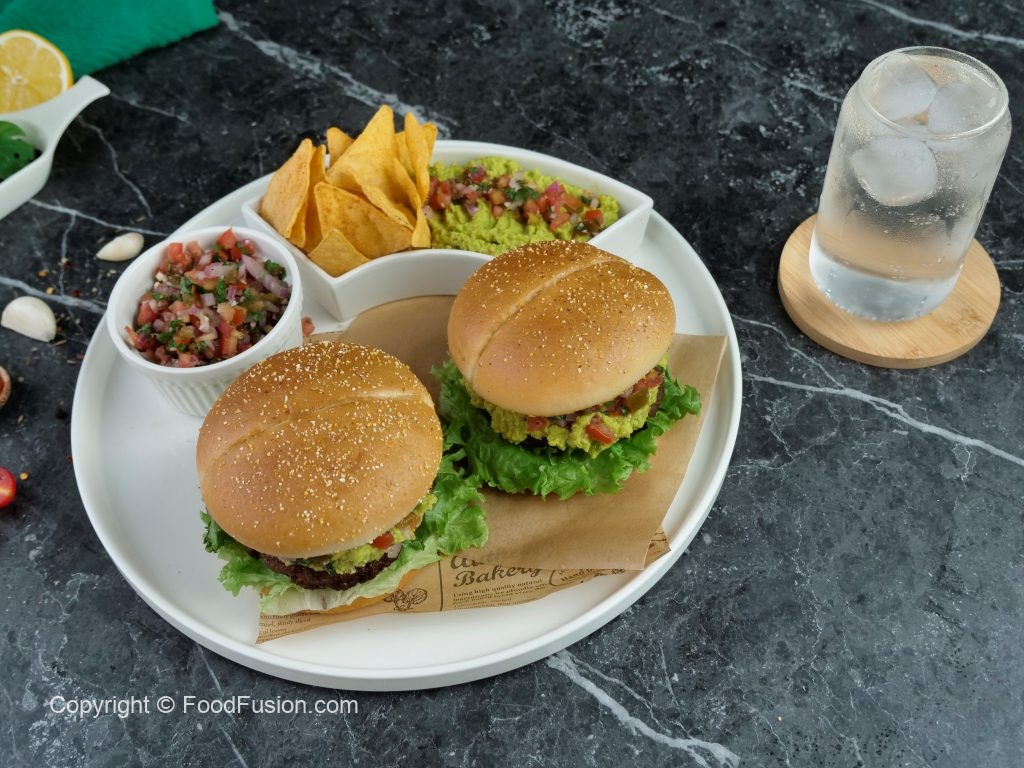 On burger bun per sour cream dal ker pheela lein,salad patta,guacamole aur salsa dal ker upper sa top bun rakh dein.
