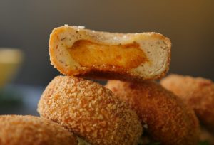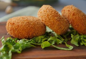 Coat in all-purpose flour then dip into beaten eggs and coat with breadcrumbs then shape into round shape (makes 24-25).