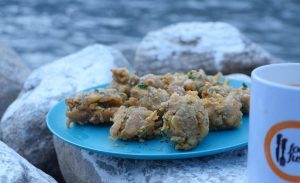 In bowl,add gram flour,cumin seeds,red chilli crushed,salt,baking powder,tikka masala and mix well.