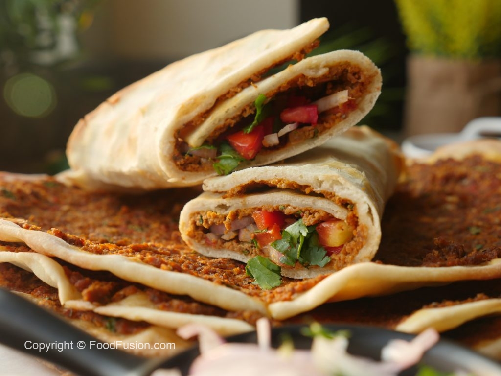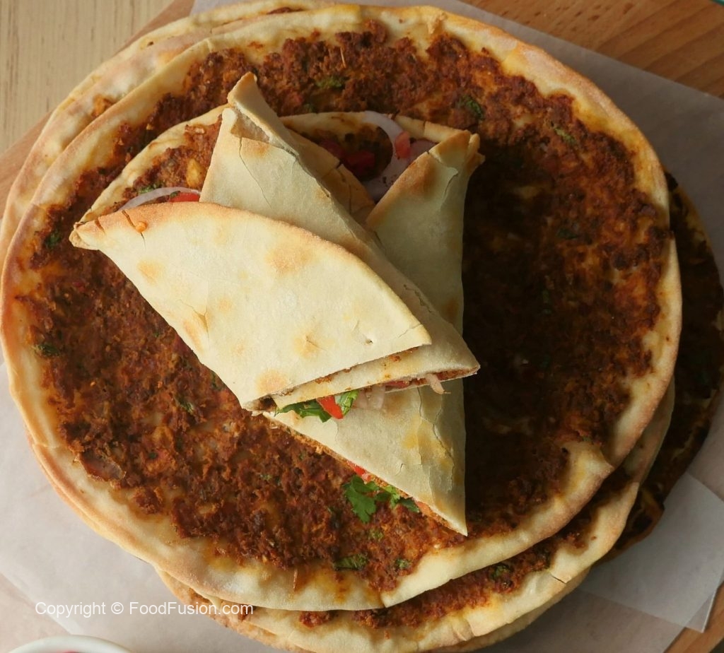 Lahmacun ko pyaz,tamatar,hara dhania aur lal mirch crushed ka saath serve karein!