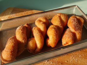 Take a piece of dough and roll it out on your working place so it forms a rope 8 inches long and ½ inch in diameter.If it’s sticky,sprinkle some flour on the area you’re working in.When you roll out the dough, move one hand upward and the other downward so that the rope is twisted in between your hands as you roll it (makes 15-16).