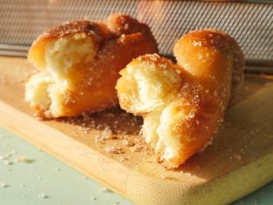 Put twisted donuts in sugar+ciannmom mixture and shake a few until they are evenly coated.