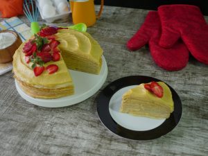 Remove from frying pan and place the crepe on a kitchen towel so that it will not stick & allow the layers to cool down completely at room temperature before stacking them (makes 15).