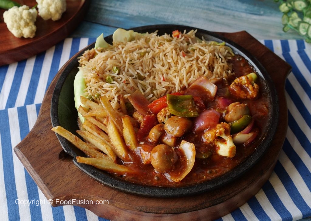 Makhan dal ker pheela lein,band gobhi leaves rakh ker upper sa fried rice,potato fried,stir-fried vegetables aur tayyar shashlik sauce dal ker serve karein!