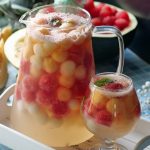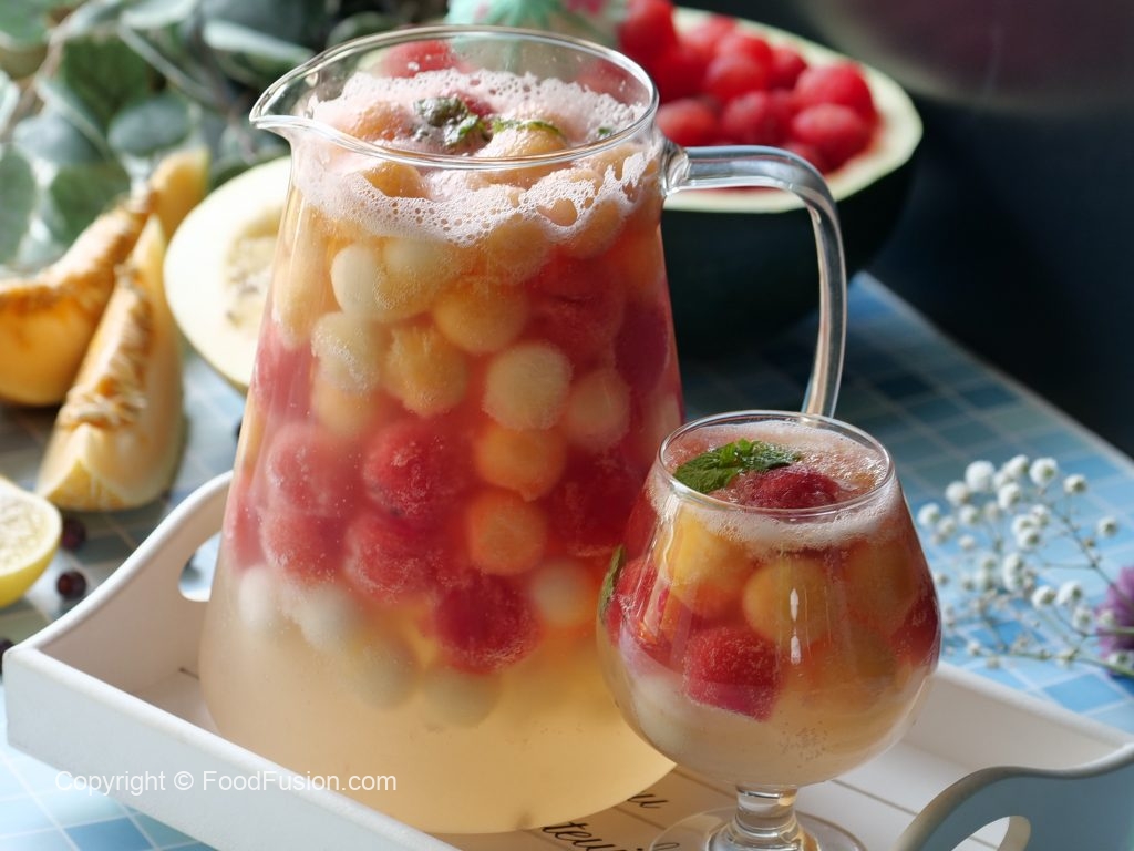 In a pitcher,add melon balls,watermelon balls,honeydew melon balls,prepared juice,7up,mint leaves,stir & serve!