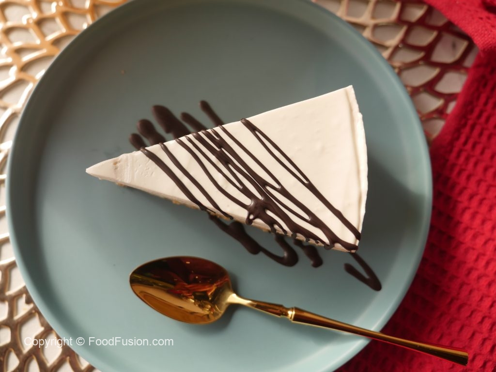 Cheesecake ko melted dark chocolate aur chocolate button sa decorate ker len desired slices mein cut ker ka serve karein!